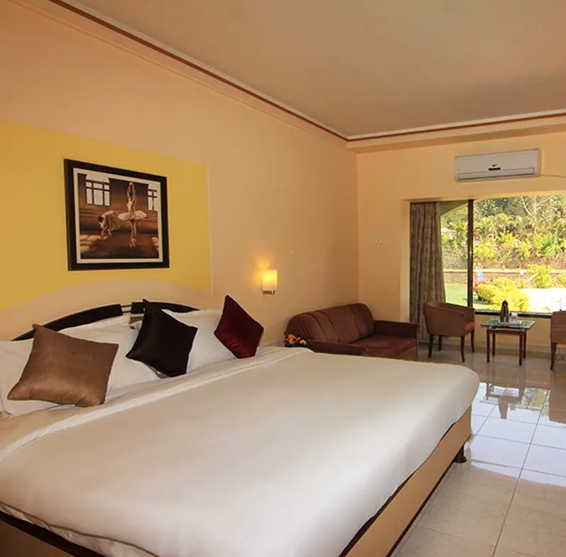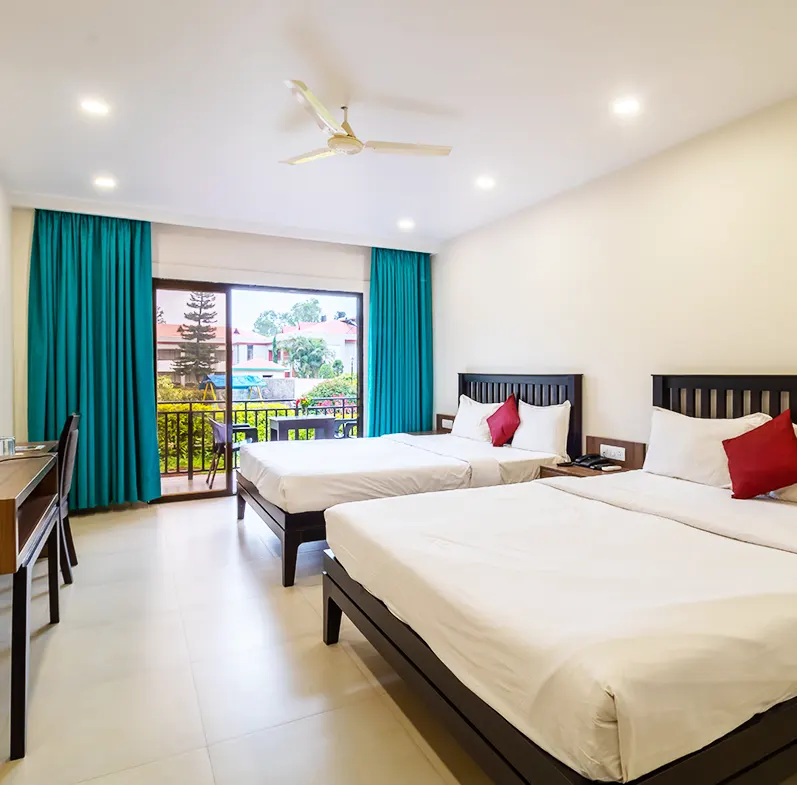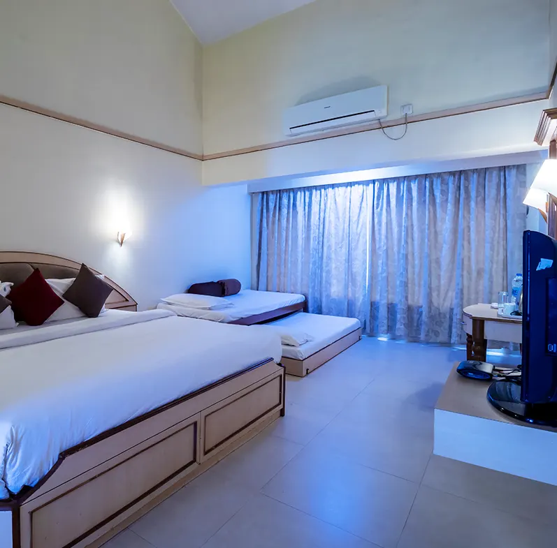 A thoughtfully designed base category room with ground access accommodations and a tranquil backyard view . It includes a plush king-size bed, two single beds, a cozy dining area, and a stylish cubical shower bathroom for ultimate comfort.