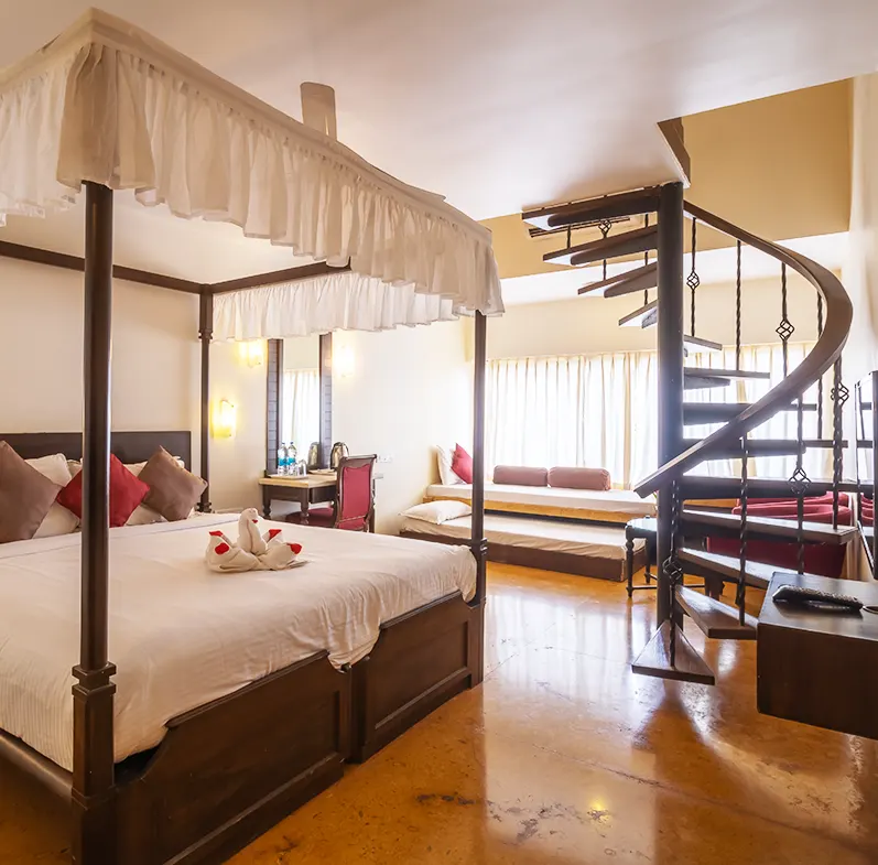 Super Deluxe Room: Modern-retro themed with garden access. Includes king bed + 2 singles, dining area & cubicle shower. Perfect for stylish, comfy stays!