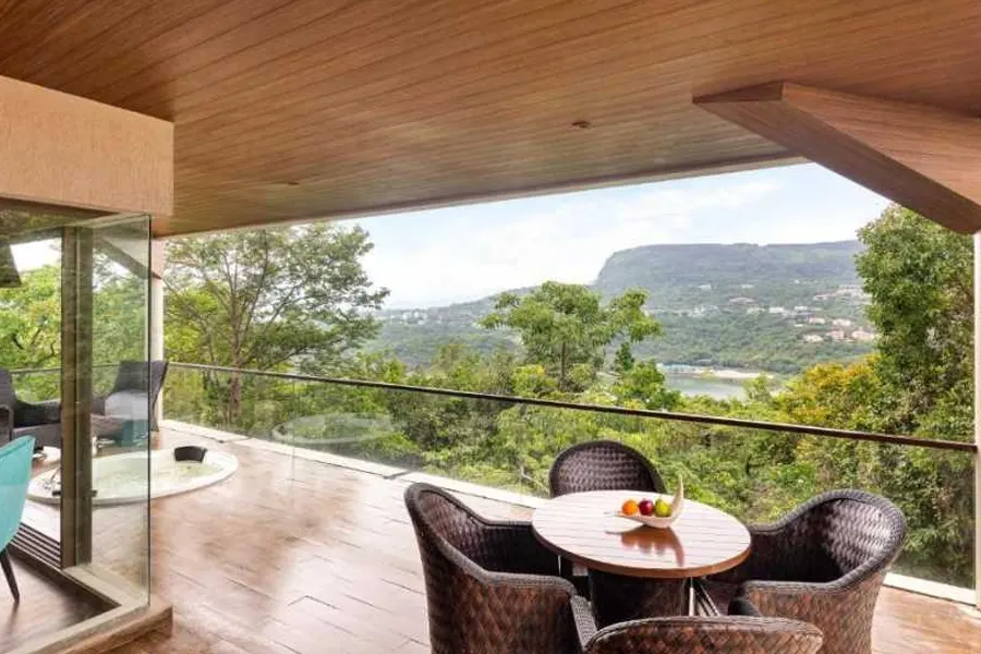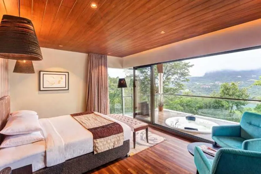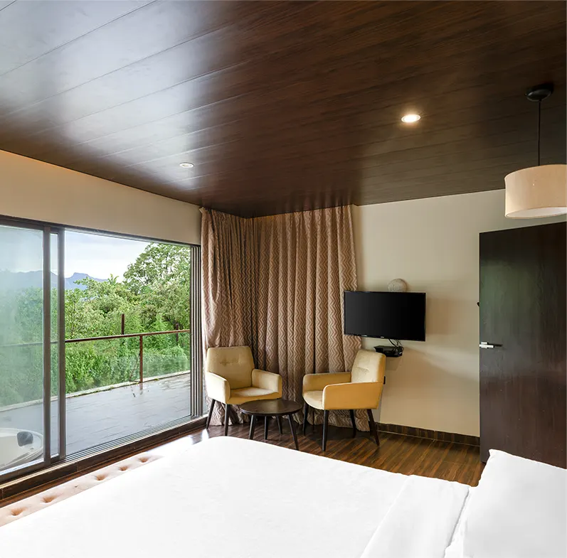 Aveda Suites offer luxurious private villas with a Jacuzzi, spacious living room, elegant bedroom, and a large luxury bathroom. Enjoy stunning mountain and forest views. Room size: 1100 sq. ft. Perfect for a peaceful and comfortable retreat in nature.